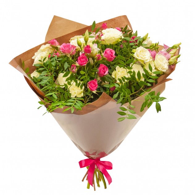 Состав: Упаковка для букета: крафт-бумага, Фисташка 4шт., Лизиантус 4шт., Роза кустовая 7шт.