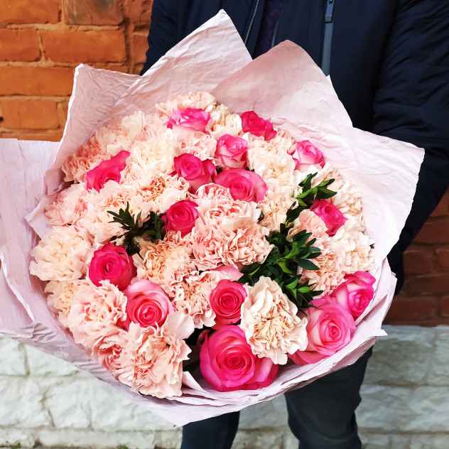 Шикарный букет из роз и диантуса.