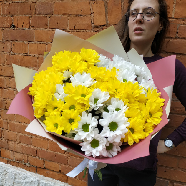 Яркий и солнечный букет. Состав Хризантема - 9 шт. Лента - 1 шт