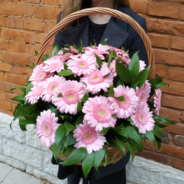 Очаровательная корзинка, полная розовых гербер, пленит своей красотою и очарованием. Гербера, цветок очаровательный и скромный, но в такой необычной подаче - действительно впечатляет! Герберы, как маленькие солнышки - радуют в непогожий день, вызывают улыбку и впечатляют.