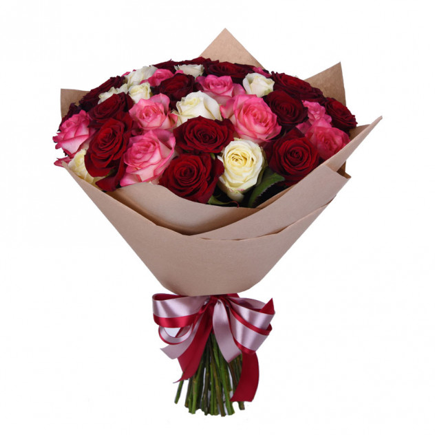 Состав: Упаковка для букета: крафт-бумага, Роза красная 60 см 12шт., Роза белая 60 см 12шт., Роза розовая 60 см 11шт.