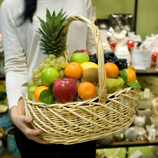 Состав: ананас 1, яблоко красное 2, яблоко зеленое 2, яблоко желтое 2, лимон 1, апельсин 3, мандарин 3, киви 2, бананы 5, груша 2, виноград зеленый 1, виноград черный 1.