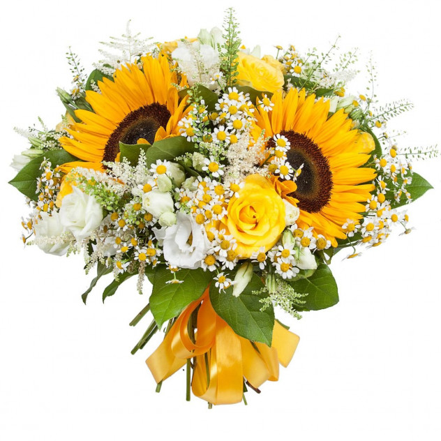 Лизиантус 3шт., Матрекария 8шт., Хелиантус (подсолнух) 3шт., Салал 8шт., Роза желтая 60 см 5шт., Грин белл 3шт.