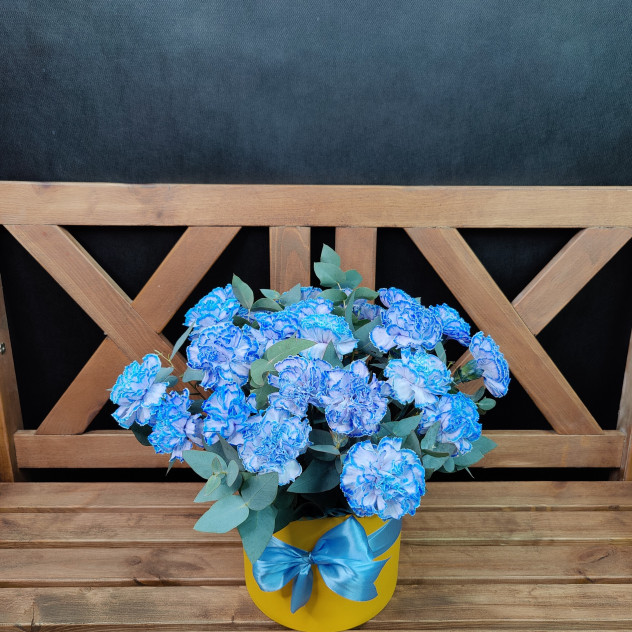 Пышная, ароматная, композиция из диантуса и эвкалипта в шляпной коробке и стильном дизайне.